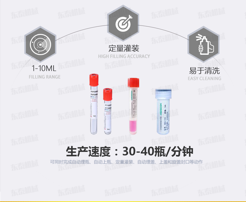 本機(jī)是在引進(jìn)和吸收國(guó)外技術(shù)的基礎(chǔ)上,由我公司自主研發(fā)的一款I(lǐng)VD診斷試劑灌裝旋蓋一體機(jī),能同時(shí)完成自動(dòng)理瓶、自動(dòng)上瓶、定量灌裝、自動(dòng)理蓋、上蓋和旋蓋封口等動(dòng)作。本機(jī)采用日本高精度封閉式凸輪分度工位器,精度高,運(yùn)行可靠,使用壽命長(zhǎng)。該分度器結(jié)構(gòu)簡(jiǎn)單,長(zhǎng)期使用無需維修。該型號(hào)設(shè)備主要用于ⅣD體外診斷試劑制藥、生物制藥行業(yè)及科研領(lǐng)域裝。機(jī)器設(shè)計(jì)緊湊合理、外形簡(jiǎn)潔美觀,灌裝量調(diào)節(jié)方便。