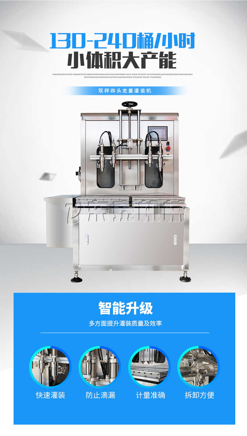 5. 該設(shè)備配備四頭(大小兩組)雙泵,凈重/毛重、自動(dòng)/手動(dòng)功能一鍵切換,進(jìn)一步滿足客戶精度,速度,低投資需求。