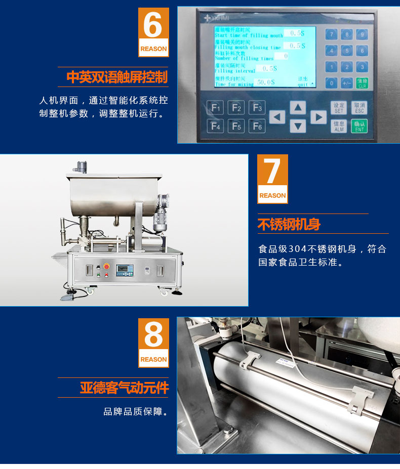 產(chǎn)品簡(jiǎn)介:半自動(dòng)醬類醬料灌裝機(jī)SFM系列結(jié)構(gòu)合理、機(jī)型小巧、性能可靠、定量準(zhǔn)確、操作方便。整機(jī)304不銹鋼,灌裝悶頭防漏料防滴油,氣缸驅(qū)動(dòng)結(jié)構(gòu),加大200L料斗,品牌全鋁殼銅芯大功率攪拌電機(jī),變頻調(diào)速,PLC智能控制,用戶可根據(jù)需要任意調(diào)節(jié)灌裝量及灌裝速度,灌裝精度高。